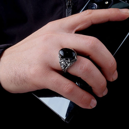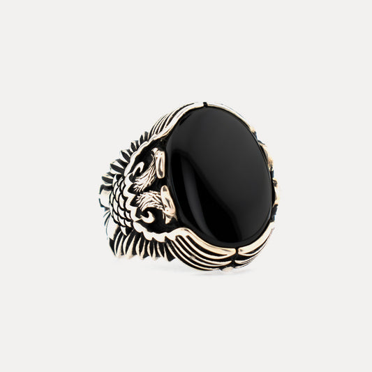 Bague en argent avec pierre d'onyx à deux têtes BLK009