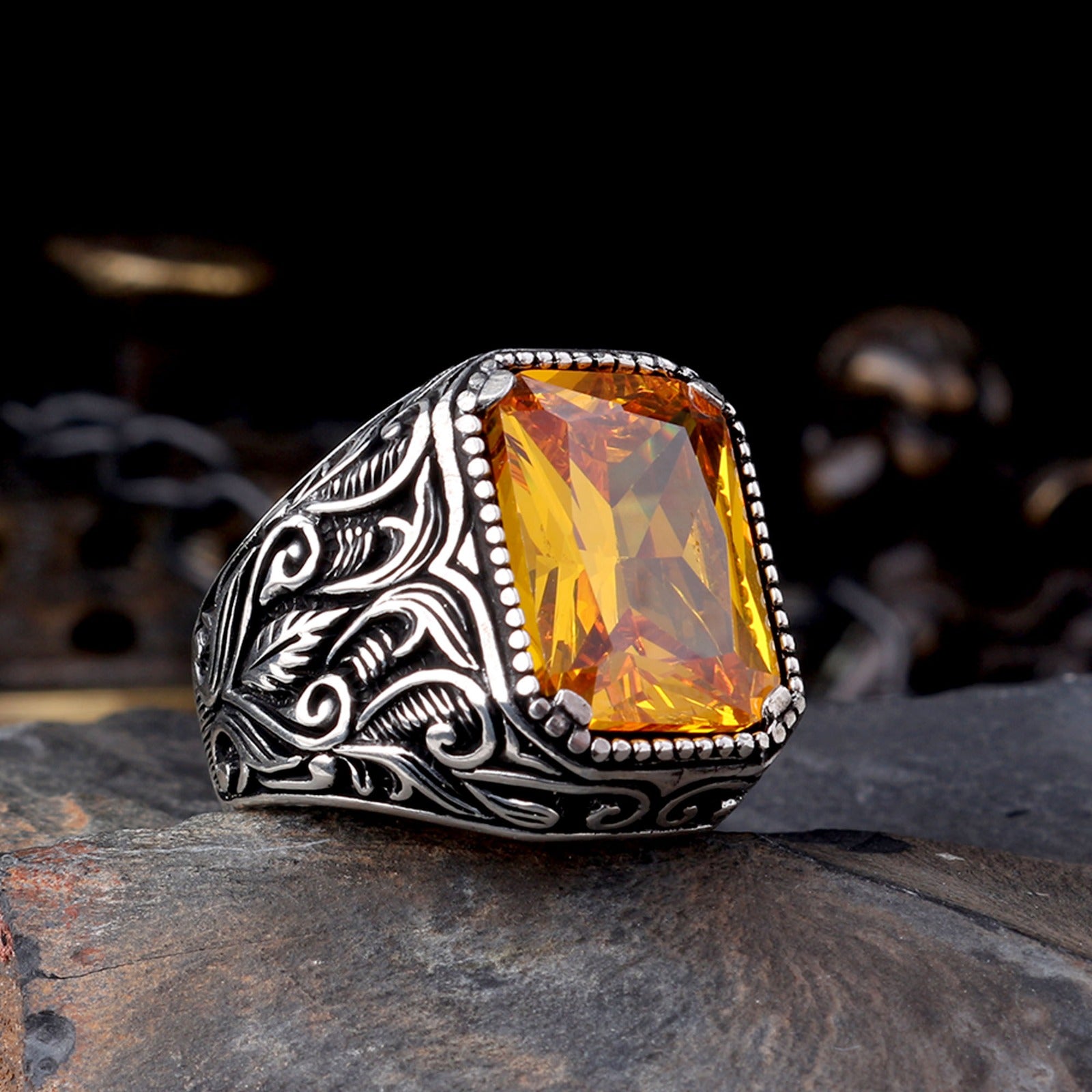 Bague luxueuse pour homme en argent 925 ornée d'une superbe pierre de zircone jaune pour un look élégant.
