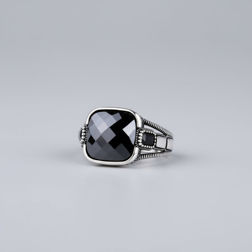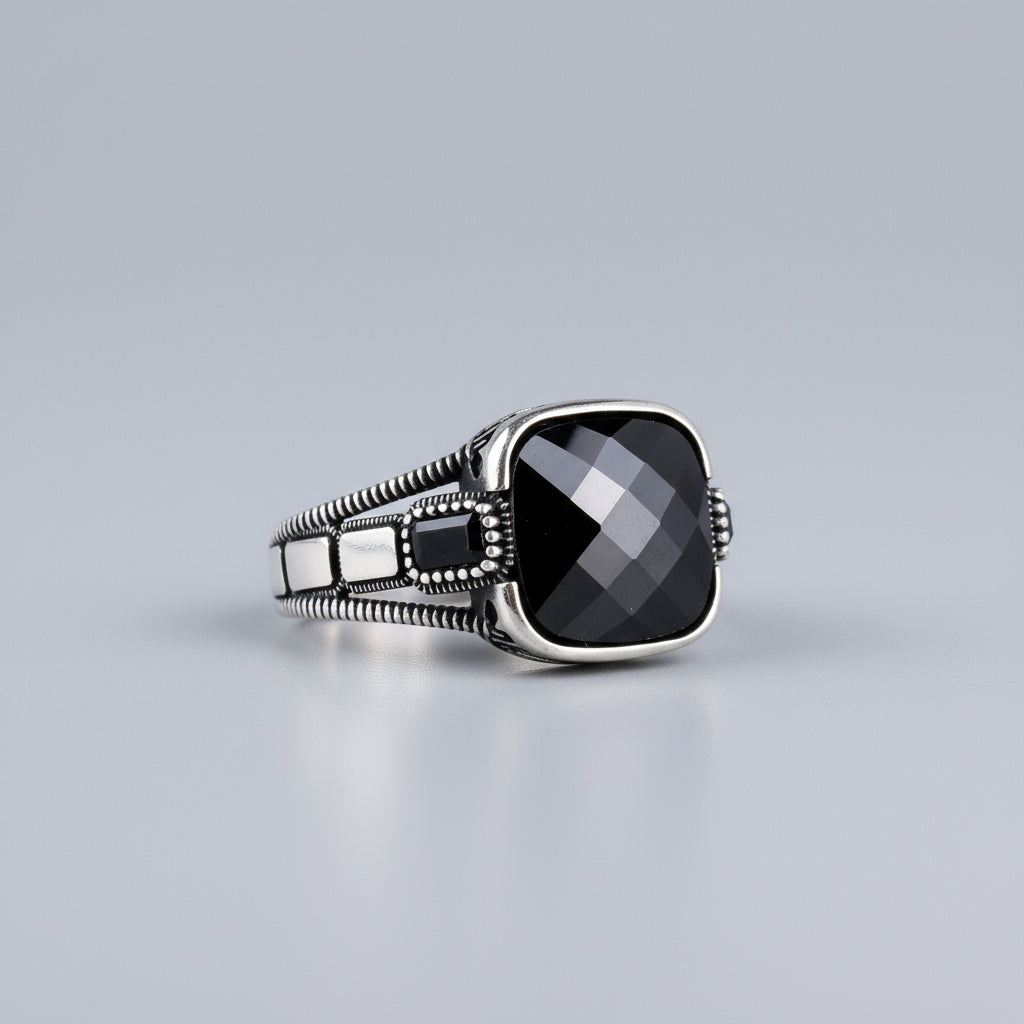 Stoere en stijlvolle herenring van 925 zilver met een grote zwarte steen – voor een krachtige uitstraling.