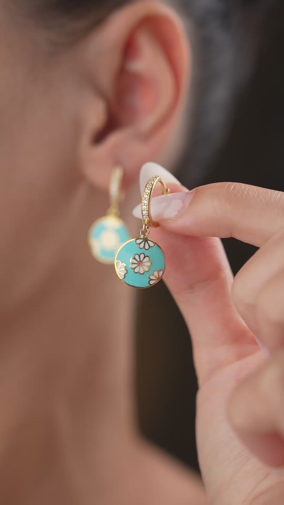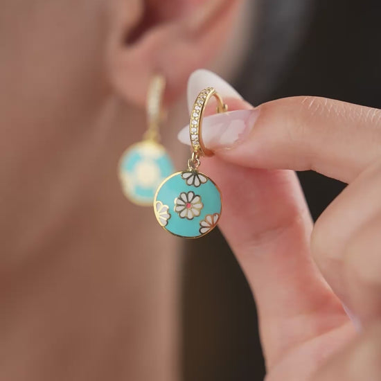 Ronde oorbellen met zirkonia steentjes en turquoise emaille met bloemmotief.
