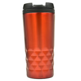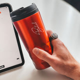 Tasse thermos en acier inoxydable à double paroi, étanche, avec couvercle à vis et ouverture à clic - peut être encliquetée une fois ouverte -.