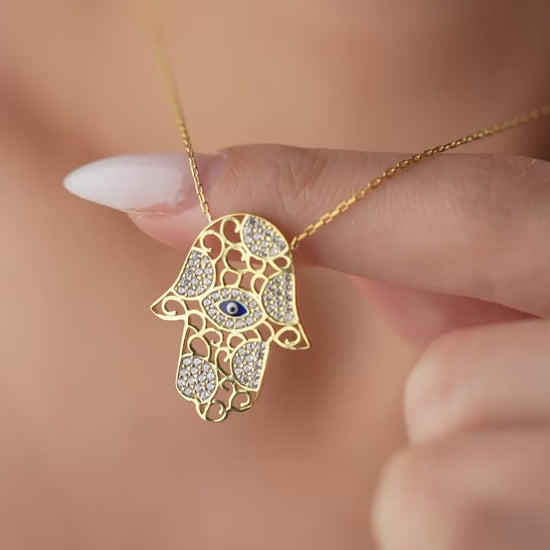 Vergulde ketting met Hamsa hand, blauwe oogdetail en fonkelende zirkonia steentjes.