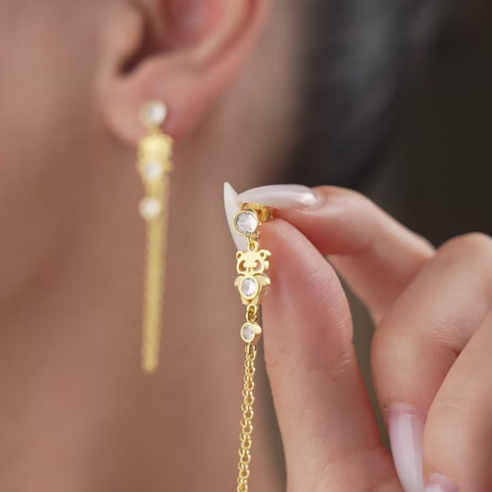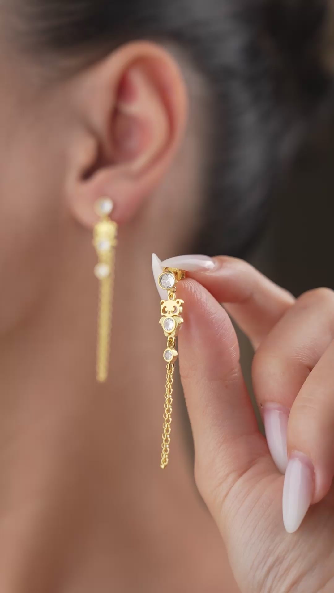 Goudkleurige panda oorbellen met zirkonia en sierlijke hangende kettingen.