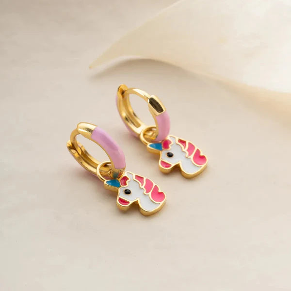 Deze vrolijke kinder oorbellen met een eenhoorn design zijn gemaakt van 925 sterling zilver en verguld met goud. De roze en kleurrijke emaille details maken het perfect voor kleine eenhoornliefhebbers. Comfortabel, veilig en betoverend mooi!