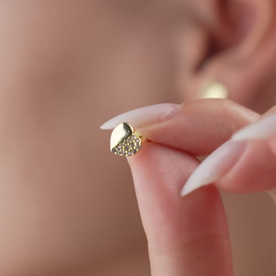 Petites boucles d'oreilles puces en forme de cœur, avec une moitié brillante et incrustée de pierres.