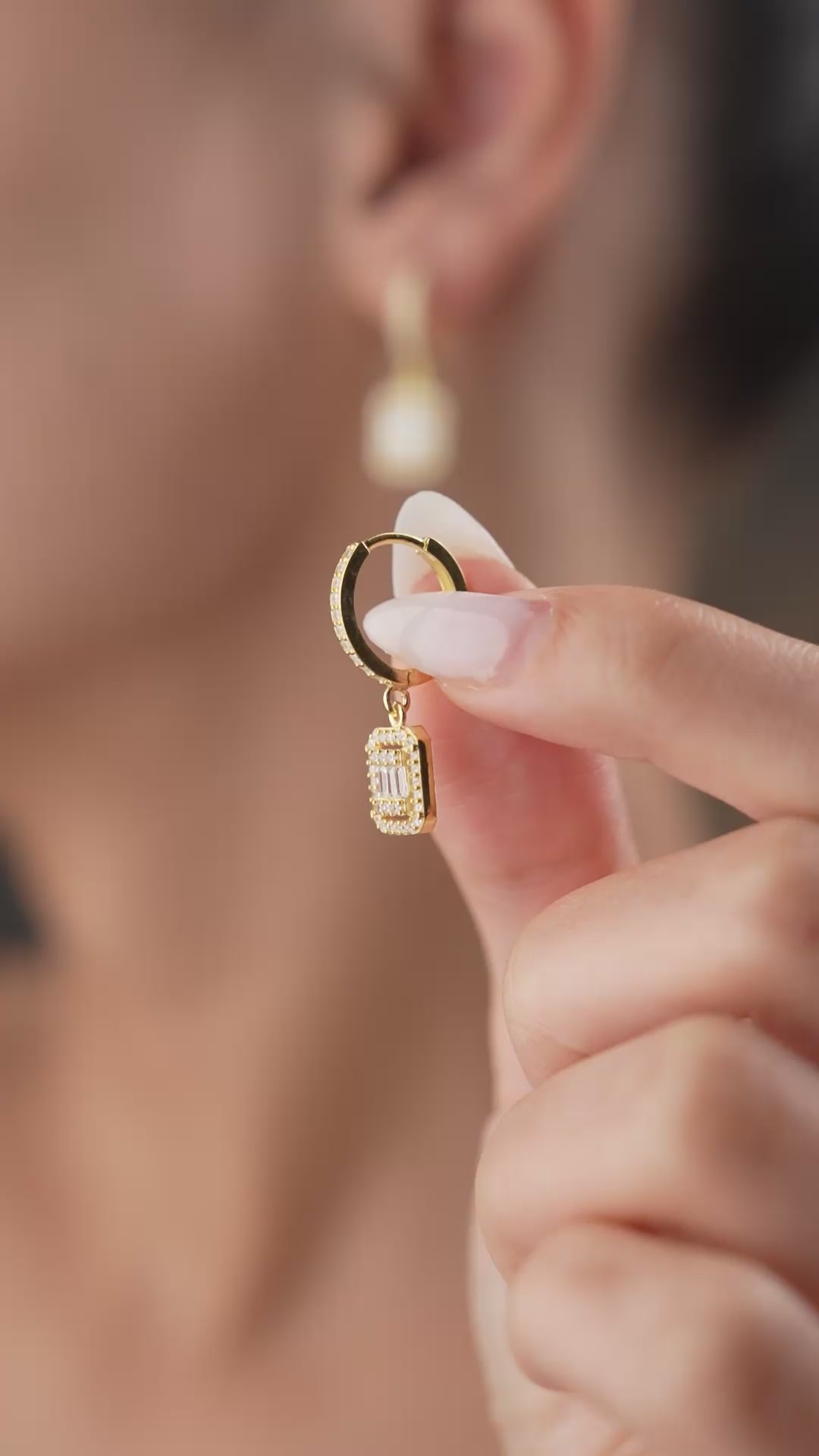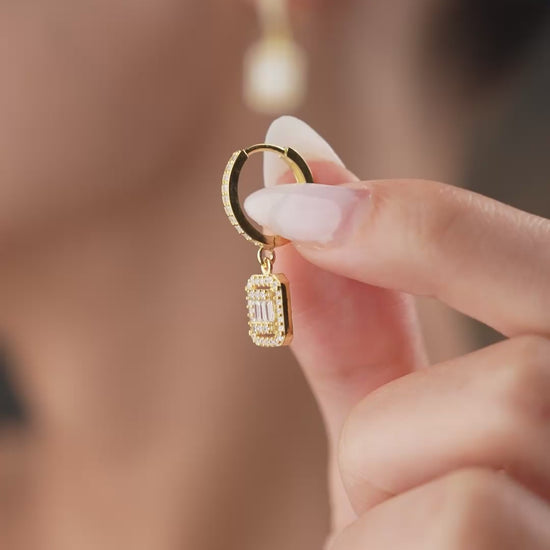 Boucles d'oreilles élégantes ornées de pierres rectangulaires en forme de baguette et de zircones étincelantes.