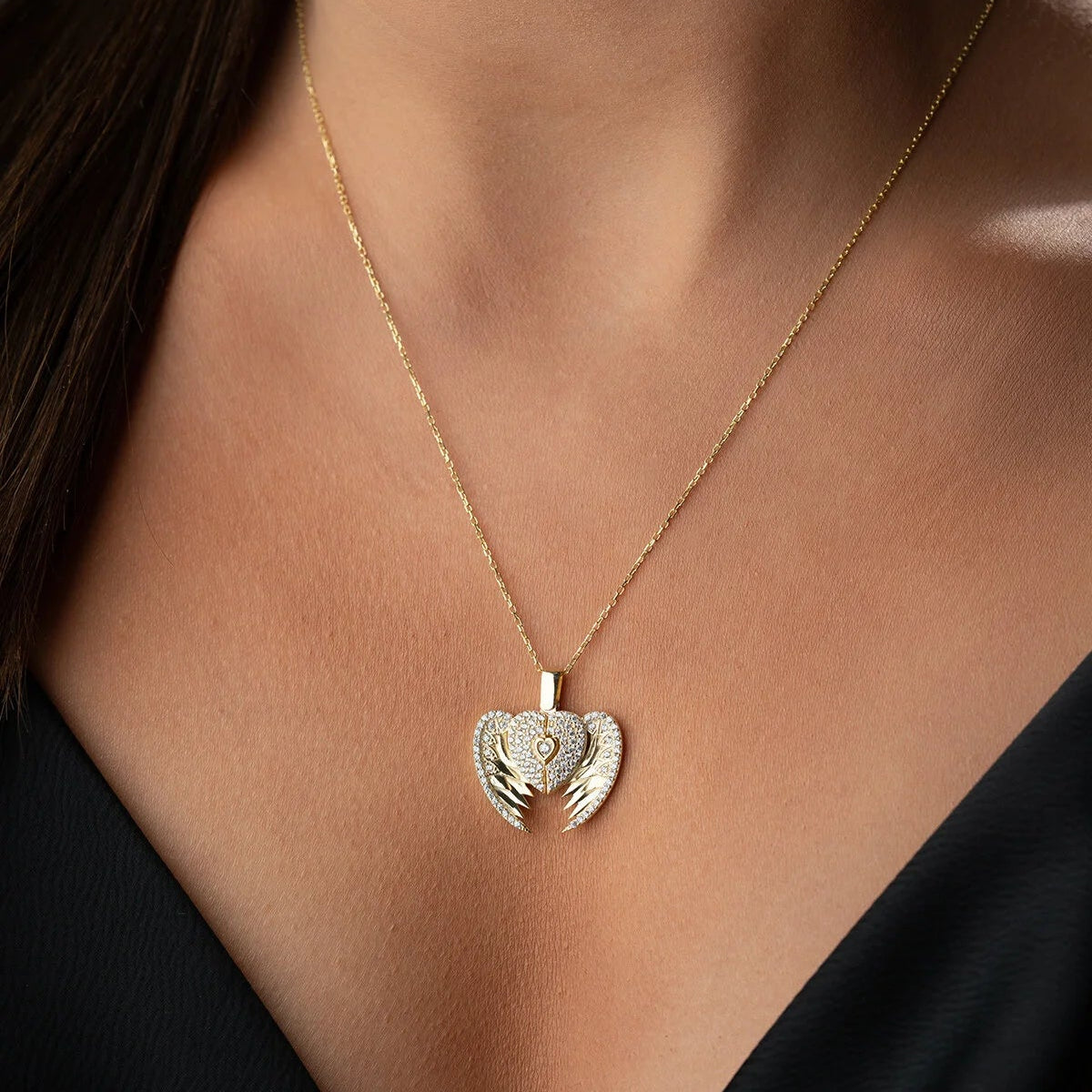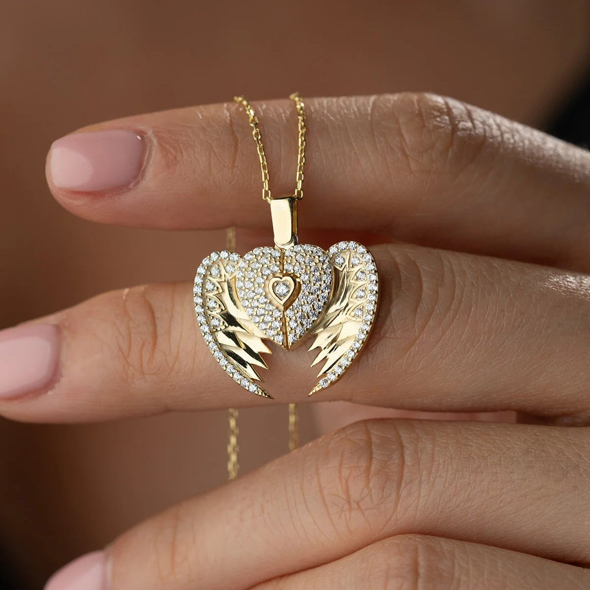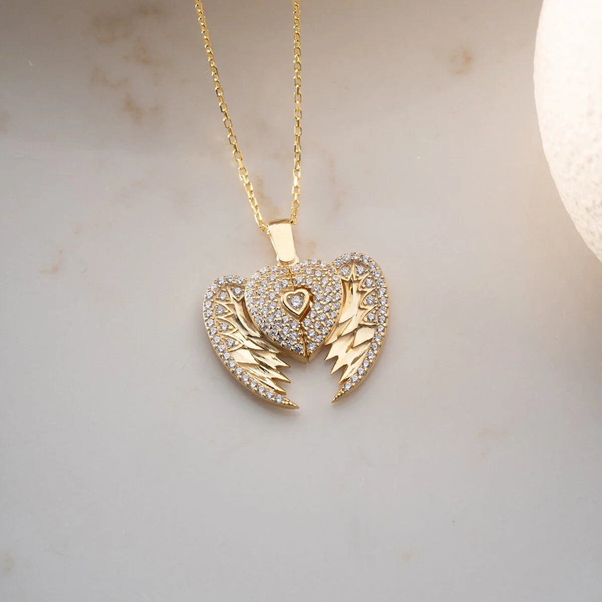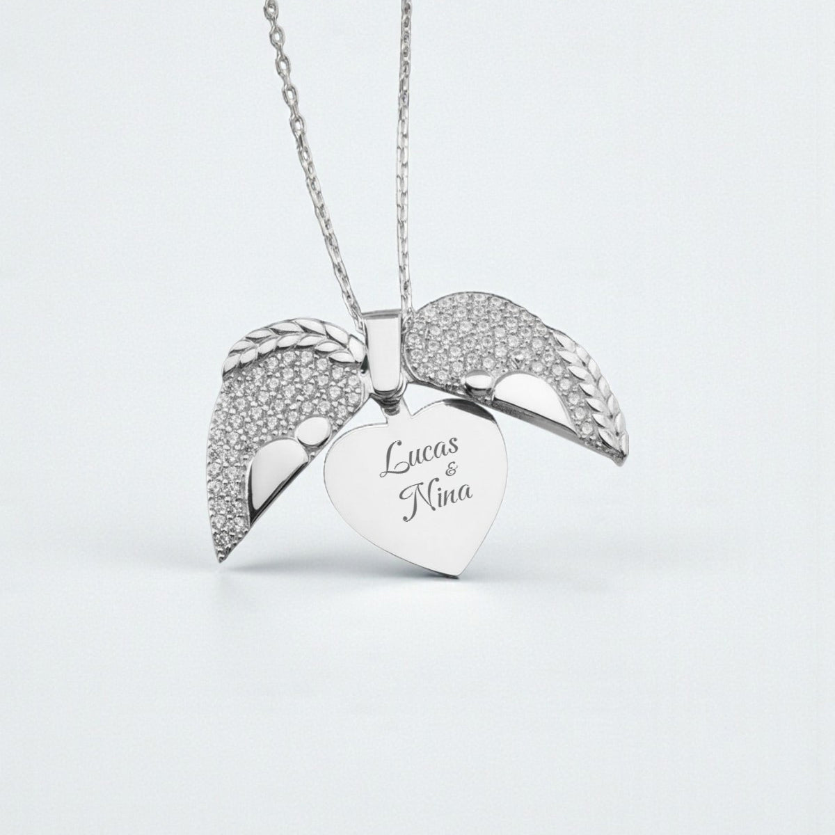 Collier unique orné d'ailes déployées et d'un cœur. Gravure du nom et de la date disponible. Un cadeau spécial et personnel.