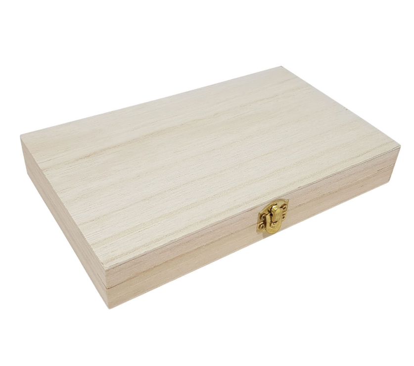 Een stijlvolle en duurzame opbergkist gemaakt van lichtgewicht paulowniahout. Deze rechthoekige houten doos is voorzien van een stevige clipsluiting en biedt ruimte voor een persoonlijke boodschap aan de binnenkant van het deksel – ideaal als cadeau of herinnering bij een speciaal afscheid of bedankmoment.