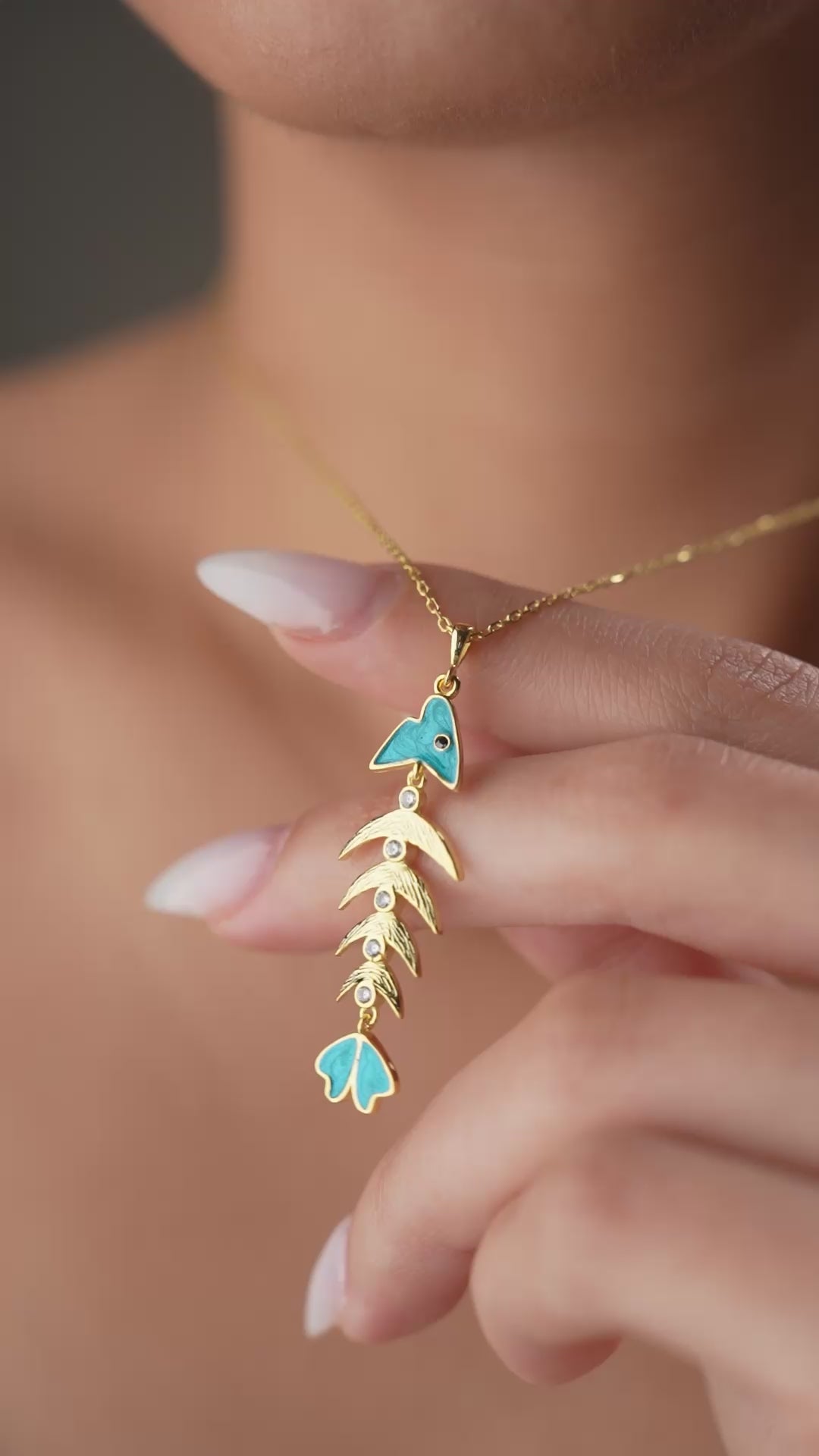 Goudkleurige ketting met turquoise emaille en zirkonia in speels visgraat ontwerp.