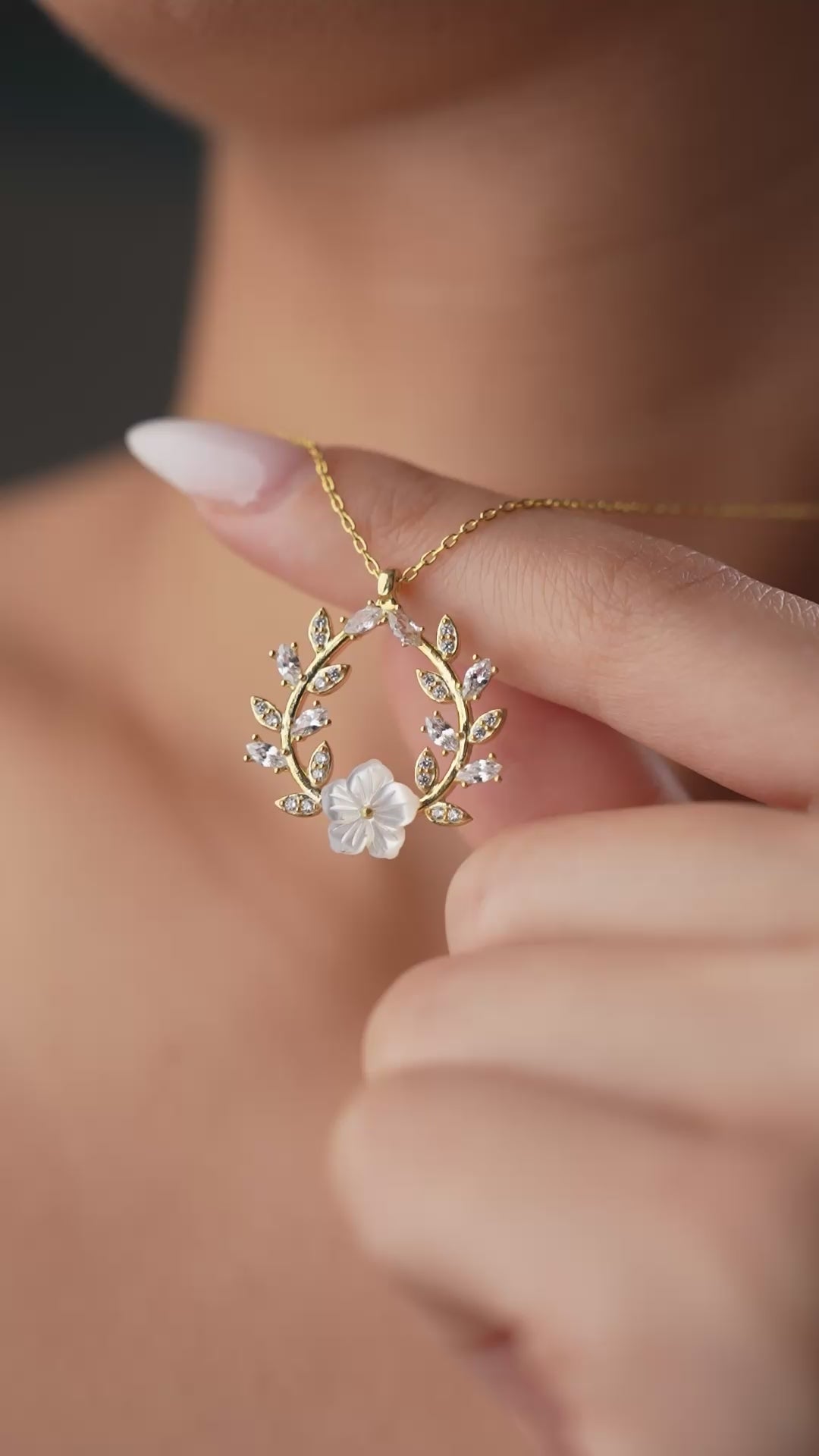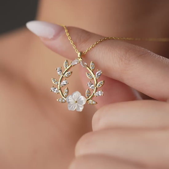 Elegante ketting met witte bloem en zirkonia bladeren in goudkleurig ontwerp.